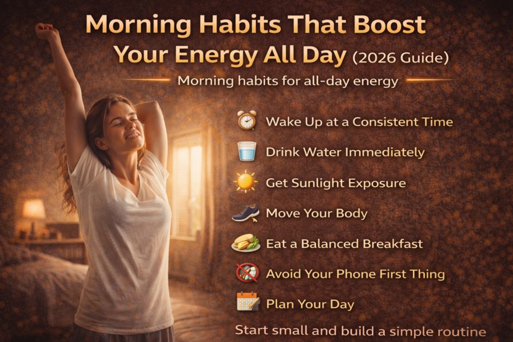 A consistent wake time, water, sunlight, movement, a protein-rich breakfast, a phone-free start, and a few minutes of planning are not complicated changes. But together, they create a morning that actively generates energy rather than one that passively drains it.